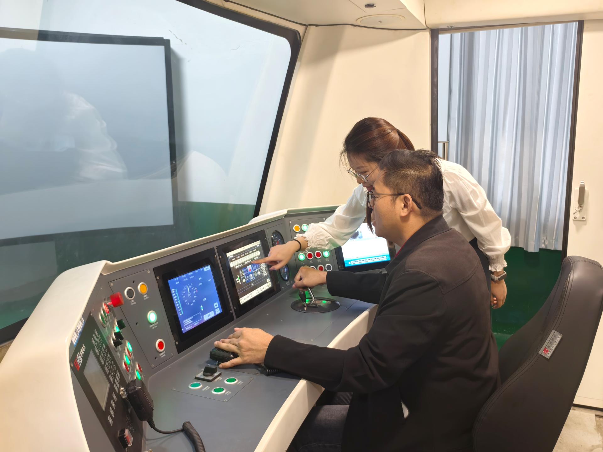 代表团参观了重点实验室的先进设备,重点体验了列车模拟驾驶台、手摇道岔和行车调度沙盘等核心设备。通过亲自操作模拟驾驶系统,成员们直观感受了列车运行的操控流程与技术要点;在手摇道岔环节,了解了传统轨道切换的基本原理与安全保障;并通过智能调度沙盘的演示,深入认识了轨道交通系统协同运作的整体流程。此次实地体验使代表团对轨道交通安全运维的技术体系有了更为全面和深入地理解。