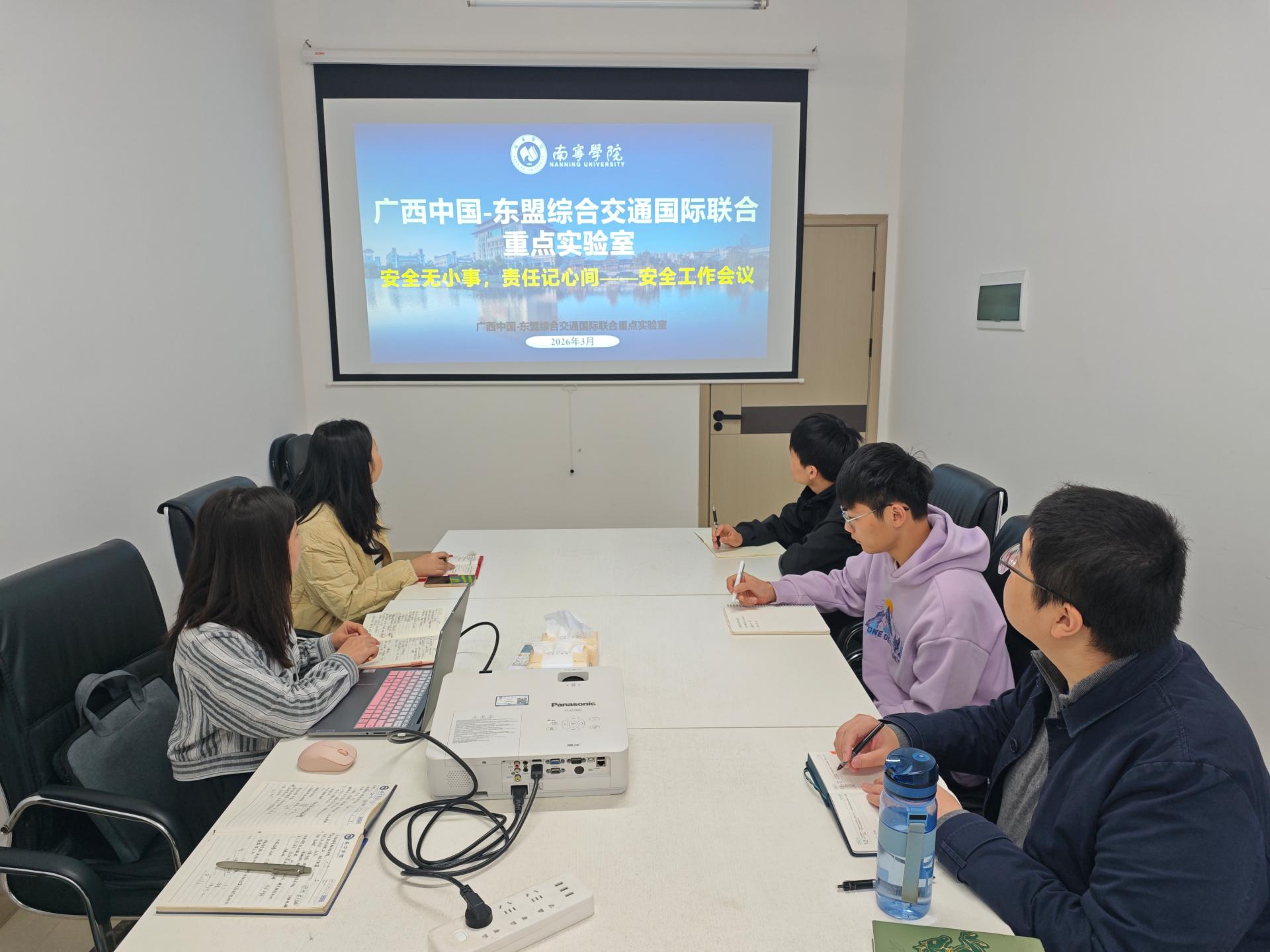 2026年3月9日,广西中国-东盟综合交通国际联合重点实验室(以下简称“重点实验室”)在东盟楼B607召开“安全无小事,责任记心间”安全工作会议。重点实验室全体人员参加会议,会议由重点实验室主任文旭光教授主持。