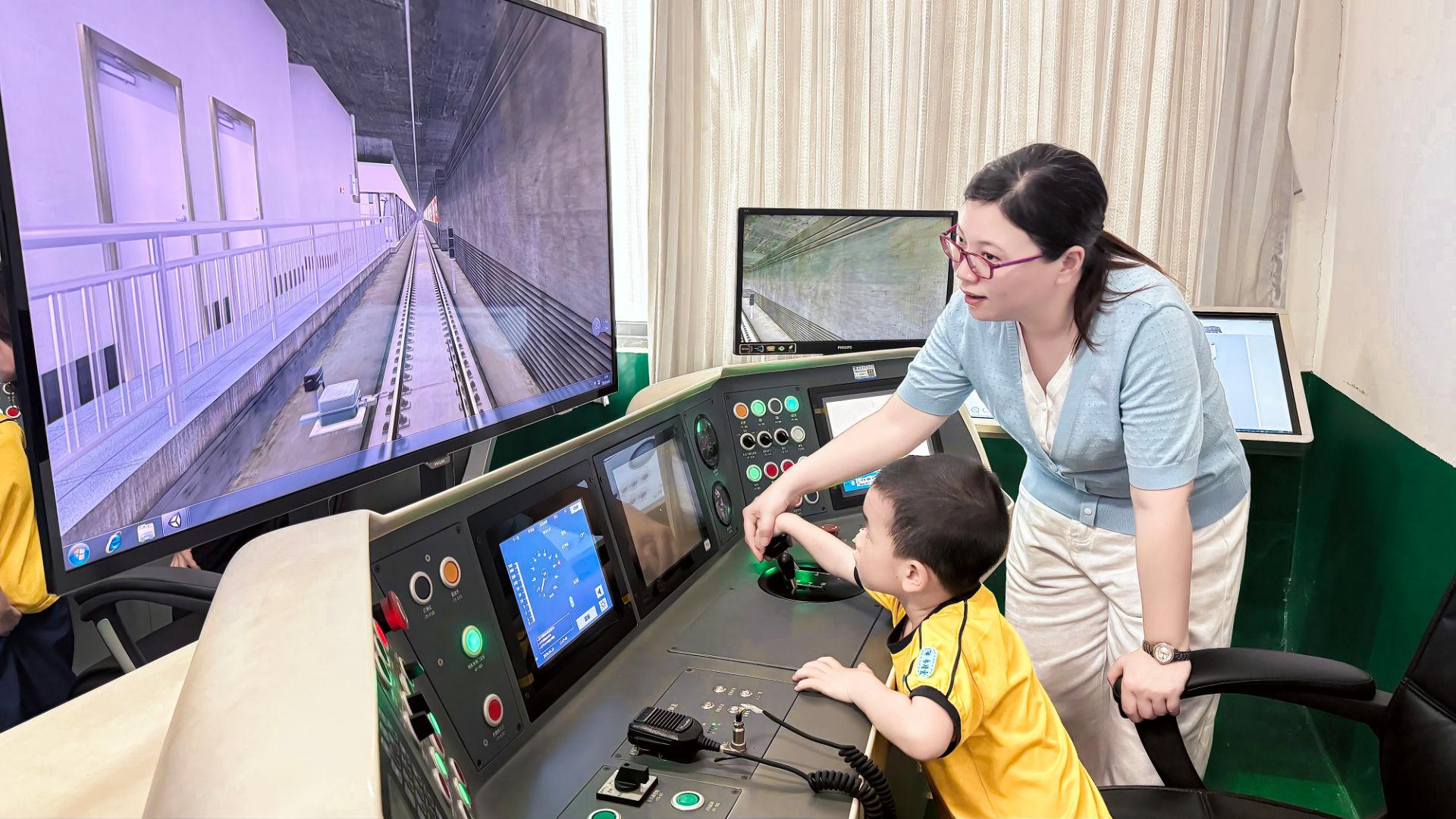在南宁学院轨道交通博物馆内,小朋友们依次参与了列车模拟驾驶体验、双层火车参观、手摇道岔操作、行车调度沙盘演示以及站务系统实验室互动等环节。在南硅谷E104的列车模拟驾驶体验环节,孩子们不仅坐上模拟驾驶台尝试操控列车运行,还观看了轨道交通、地铁相关的科普小视频,通过生动的影像进一步了解了地铁的构造与运行原理。